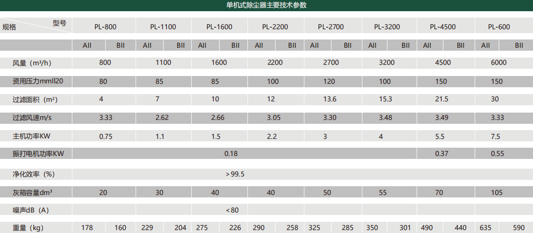 经过一段时间的生产使用,又 进一步对机组的结构进行了改进,该机组基本结构由风机、滤袋、集尘器三部分组成,各部件安装在立式框架内通过改进使机体外形上、 结构上达到新颖、美观、性能稳定,使用维修方便,命名为PL-II型